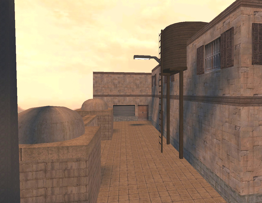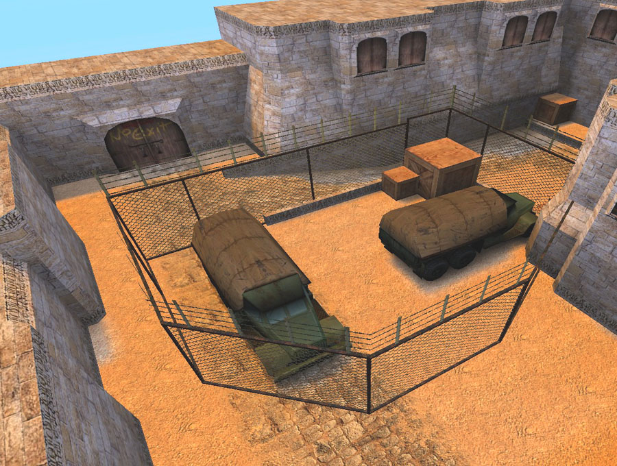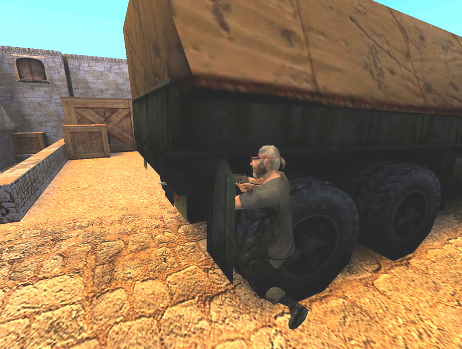 Pour l'exemple je vais évoquer le cas de la map mp_dust2. Il y en a beaucoup d'autres hélas. Celle qui nous occupe présente un beau graphisme aux couleurs chaudes et lumineuses mais hélas ternies par un petit bug aux abords des 2 camions parqués. Les bots se retrouvaient souvent englués dans le bas de la carrosserie et des pneus, révélant du fait une anomalie entre la forme codée et le modèle MD3.