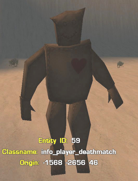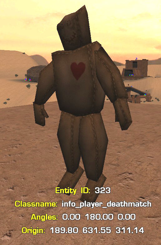 Une remarque au passage, concernant cette dernière forme qui représente une erreur de codage des bots affectés au DM. Elle a été la cause de plantages sous le défunt mode 1FX. Seul le classname info_player_deathmatch est adéquat pour coder les respawns DM