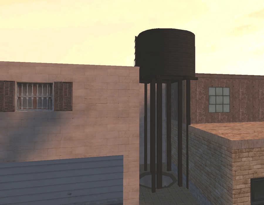 Le modèle BSP de prédilection sera l'objet Watertower du répertoire generic. Ce modèle illustre un château d'eau muni d'une échelle verticale. L'astuce est de positionner la structure principale du réservoir et de son support à l'intérieur d'un ensemble solide déjà en place dans le décor, de manière à la rendre invisible, excepté l'échelle. Une illustration sera plus explicite.