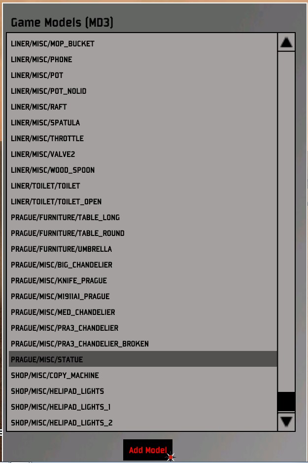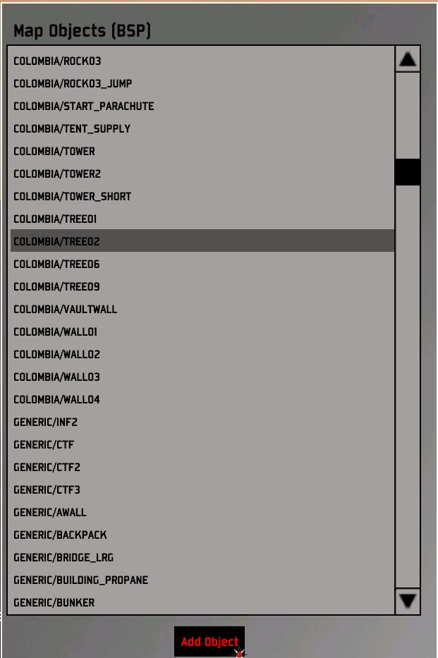 Boutons dédiés au choix des différents objets, bots, modèles MD3, modèles BSP,