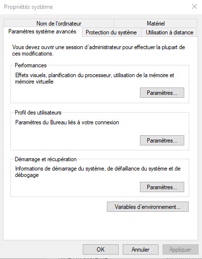 • Vous obtenez l'interface suivante. Cliquez sur le bouton Variables d'environnement.