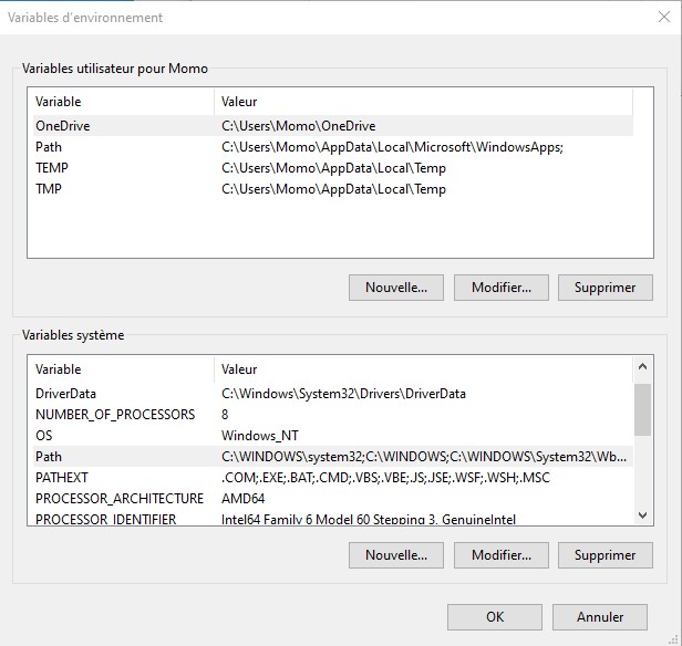 tolist.gif  Définir les variables d'environnement. La procédure suivante est associée à Windows 10. Elle est très peu différente pour les versions de Windows antérieures.