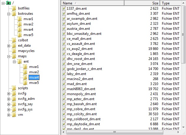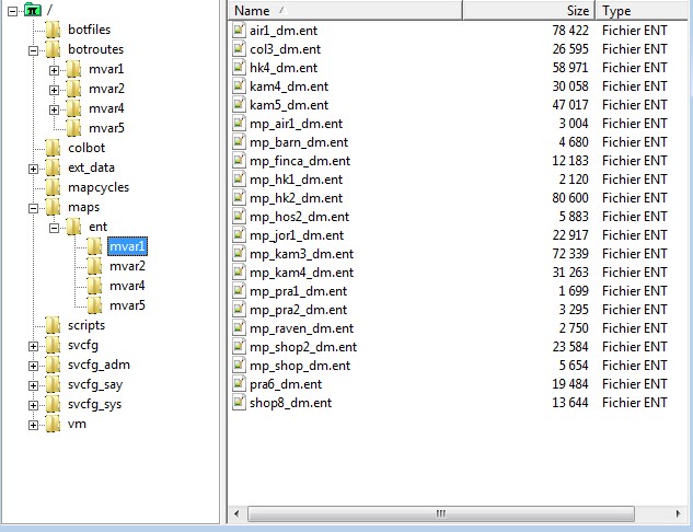 Le principe de base énonce que si un fichier ent lié à une map a été placé dans le répertoire maps/ent/mvar1 , le fichier route associé à cette map doit être placé impérativement dans le répertoire botroutes/mvar1. La concordance dans la numérotation des répertoires mvar doit être toujours respectée.