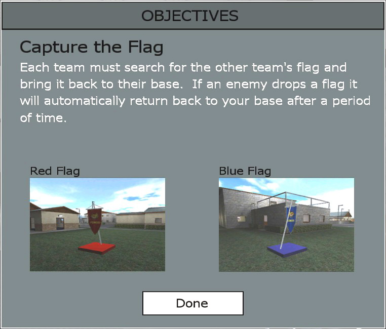 Ces images sont particulièrement dédiées à certains gametypes, notamment et principalement au CTF. Elles sont souvent utiles pour visualiser les emplacements des drapeaux dans des maps peu courantes. Elles se présentent dans le panel OBJECTIVES lors de l'arrivée sur la map ou par un clic en cours de partie, sur les onglets PLAYER/OBJECTIVES du menu principal.