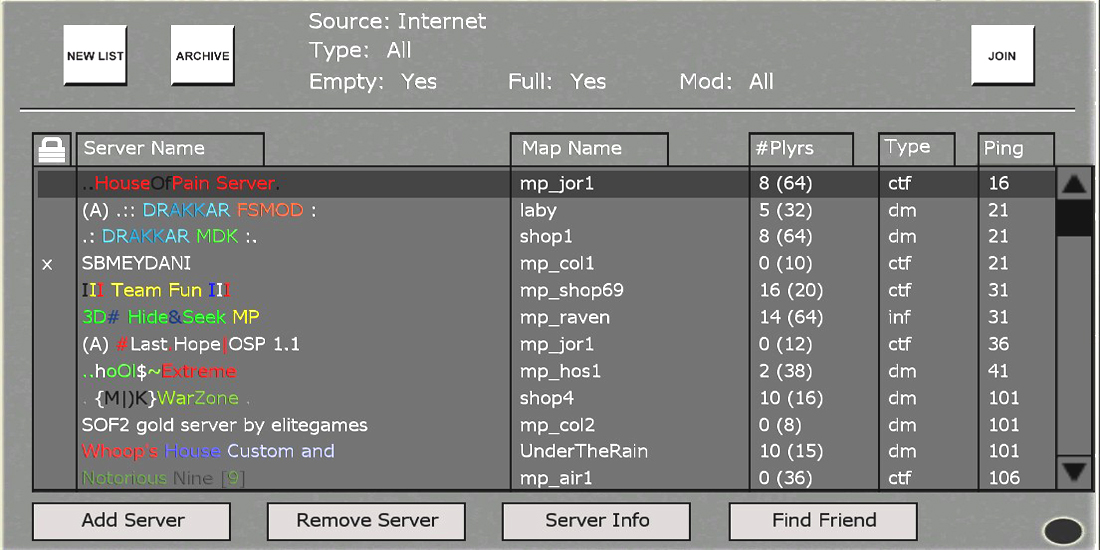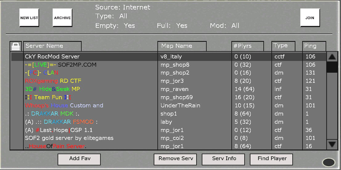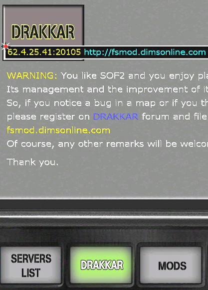Ce mode ne tourne que sous la version serveur V1.00 de SOF2, il est totalement incompatible avec la version GOLD V1.03.